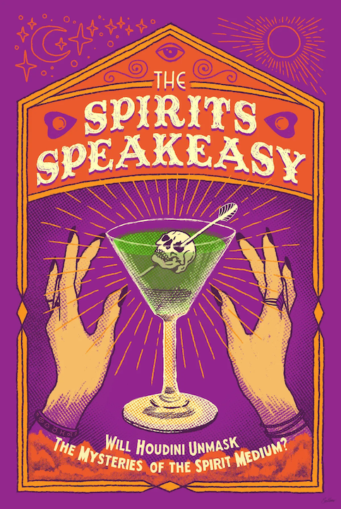 The Spirits Speakeasy summons you to step through the secret speakeasy door as a personal guest of the renowned Sir Arthur Conan Doyle. Prepare to be enthralled by an evening that seamlessly blends magic with the supernatural—and a dash of bitters.At the heart of the soirée, witness the enigmatic Margery (played by Krystyn Lambert), a medium whose powers are the talk of the town, as she faces the ultimate challenge—convincing none other than the skeptic Harry Houdini (played by Patrick Terry) of her genuine connection to the world beyond through a series of supernatural tests.